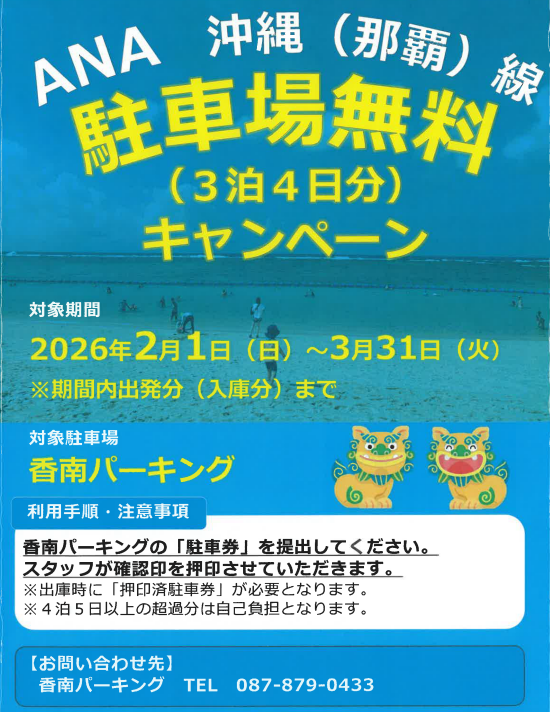 【対象者】 ANA高松-沖縄(那覇)線をご利用かつ「香南パーキング」をご利用のお客様
